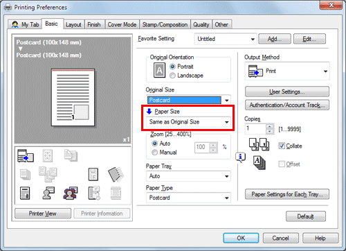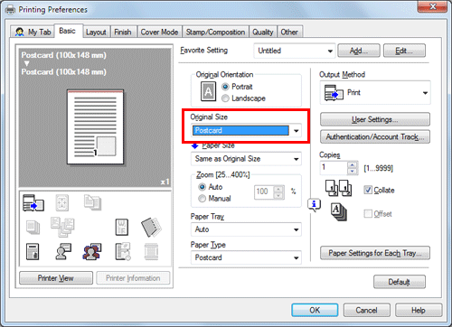 In [Original Size] on the [Basic] tab, select [Envelope] or [Postcard].