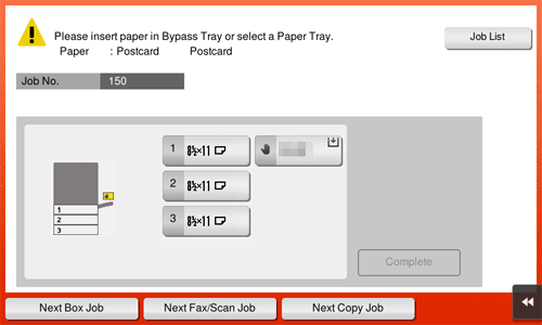If you cannot tap [Complete], check whether the paper setting of the printer driver matches that of the main unit. In addition, remove envelopes or postcards loaded in the Bypass Tray, then reload them.