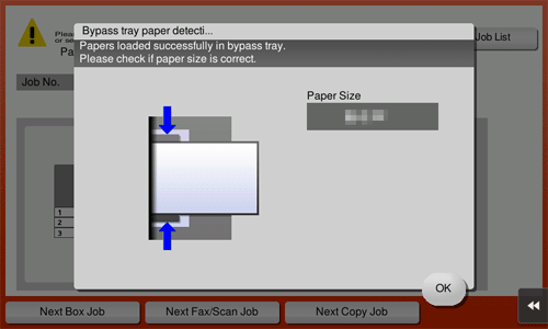 Check that the paper size set to the Bypass Tray matches the size of the actually loaded paper, then tap [OK].