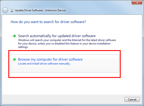 In the screen in which to select how to search the driver software, click [Browse my computer for driver software].