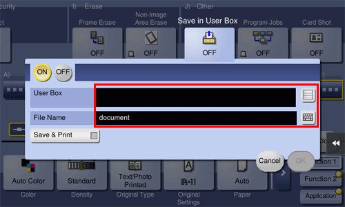 Select [Application] - [Other] to set [Save in User Box] to [ON], and tap the input area or the list icon of the [User Box].