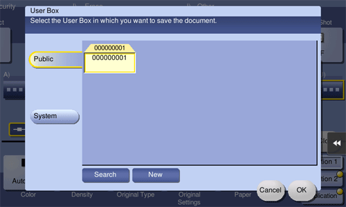 To save the original to a Public User Box, a Personal User Box, or a Group User Box, tap [Public], [Personal], or [Group] and select the destination user box. Tap [New] and enter a new user box number to register the destination user box.