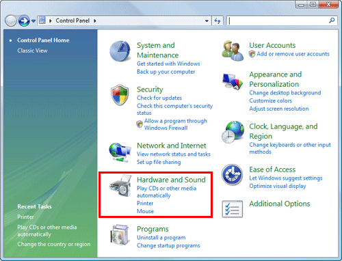 • In Windows Vista/Server 2008, click the Start menu, then click [Control Panel] - [Hardware and Sound] - [Printer].