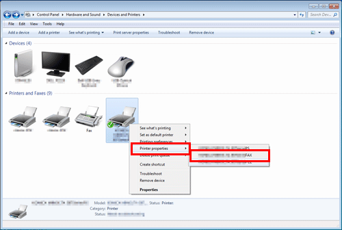 • In Windows 7/8.1/10/Server 2008 R2/Server 2012/Server 2012 R2, right-click the icon of the installed printer, and from [Printer Properties], click the displayed printer name.