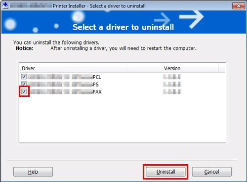 Select the fax driver you wish to delete, then click [Uninstall].