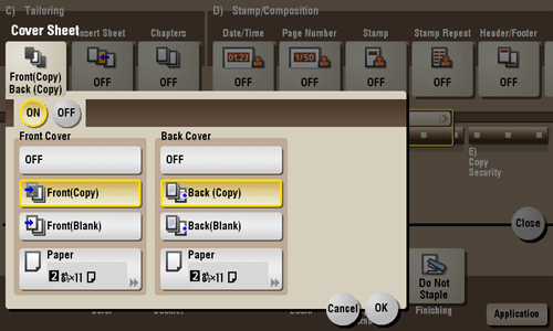 [ON]/[OFF] | Select [ON] to specify Cover Sheet. |