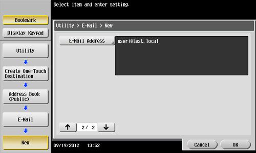 Tap [Utility] - [One-Touch/User Box Registration] - [Create One-Touch Destination] - [Address Book (Public)] - [E-Mail] - [New].