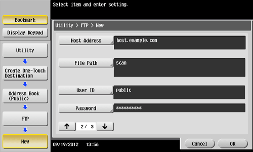 Tap [Utility] - [One-Touch/User Box Registration] - [Create One-Touch Destination] - [Address Book (Public)] - [FTP] - [New].