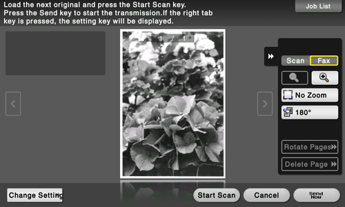 When destinations other than those for faxes are also specified for the destinations, the preview appears with the window for changing the settings for the scan function selected. To check the fax preview, tap [Fax] to switch the display.