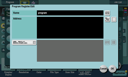 [Address] | Specify whether you want to include a destination for the program. Specify either by direct input or by selecting among the destinations registered on this machine. Only one destination can be specified. |