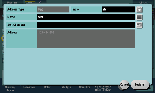 [Sort Character] | Enter the same name as the registered name (using up to 24 characters). You can sort fax numbers by name order. |