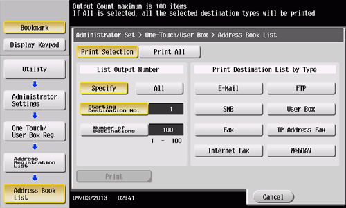 [Print Selection]: Select this option to specify the destination range and print destinations in the specified range. If you select [Print Selection], go to Step 3.