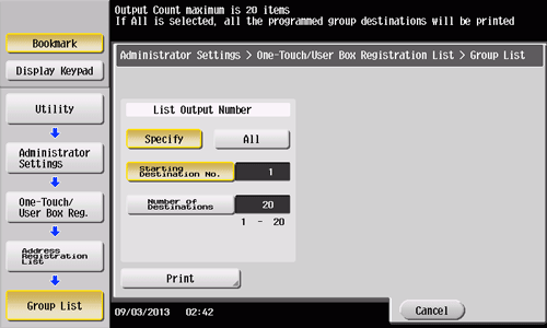 If you select [Specify] in [List Output Number], specify the range of destinations to be printed in [Starting Destination No.] (registered number of a destination) and [Number of Destinations].