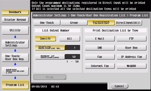 If you select [All] in [List Output Number], all programs of the type selected in Step 2 are printed. If you select [DirectInput (Selection)] in Step 2, select the type of destinations to be printed by [Print Destination List by Type].