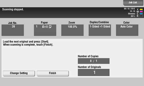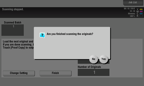 To scan the original again, tap [No]. Tap [Change Setting] to change the copy settings.