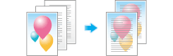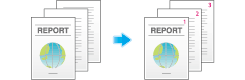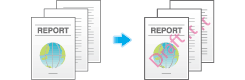 The original image scanned in the first page is overlaid on the originals scanned in the subsequent pages. The original to be scanned in the first page is used for overlay image. For example, if you copy three original pages, two pages are output, including "a merged image of the first and second pages" and "a merged images of the first and the third pages". The Overlay function is useful for overlay of text, pictures or figures not prepared in other stamp functions on the original.