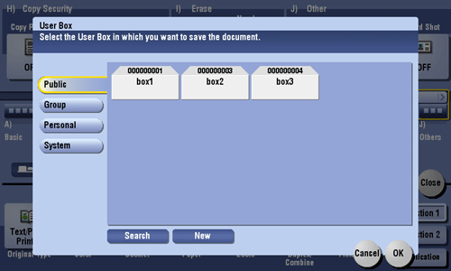 To save the original to a Public User Box, a Personal User Box, or a Group User Box, tap [Public], [Personal], or [Group] and select the destination user box. Tap [New] and enter a new user box number to register the destination user box.
