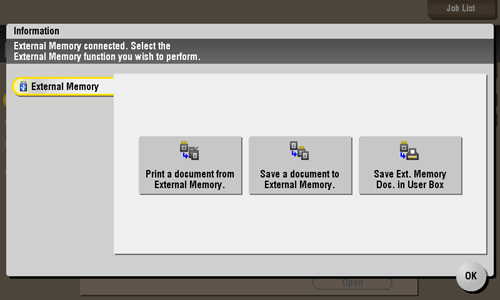 When you insert a USB memory device into the USB port of this machine, the [Information] screen appears to set a USB memory operation. You can use the USB memory immediately without selecting the User Box operation mode and without tapping the [System] - [External Memory] buttons.