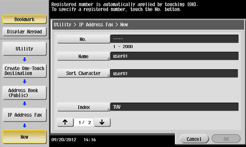 Tap [Utility] - [One-Touch/User Box Registration] - [Create One-Touch Destination] - [Address Book (Public)] - [IP Address Fax] - [New].