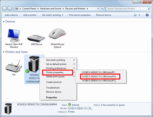 In Windows 7/8/8.1/Server 2008 R2/Server 2012/Server 2012 R2, right-click the icon of the installed printer, and from [Printer Properties], click the displayed printer name.
