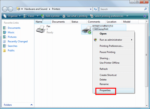 In Windows Vista/Server 2008, click the Start menu, and select [Control Panel] - [Hardware and Sound] - [Printer].