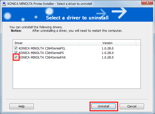 ] in the Start window, select [Control Panel] - [Programs], then click [Uninstall a program]. In the list, double-click [KONICA MINOLTA C554_C364Series(PS_PCL_FAX)].